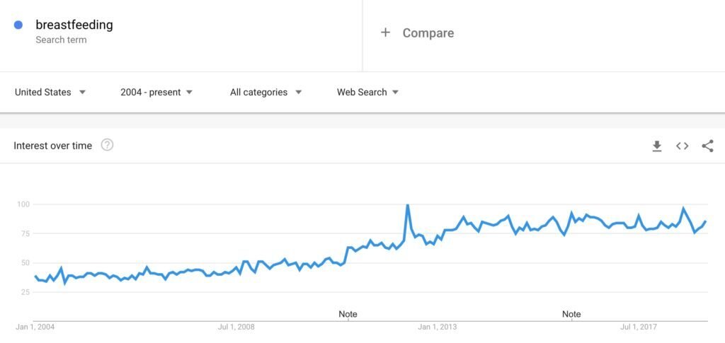 Наблюдается растущая тенденция поиска” грудного вскармливания". И эта сумма в конечном итоге равняется 368 000 ежемесячных поисков.