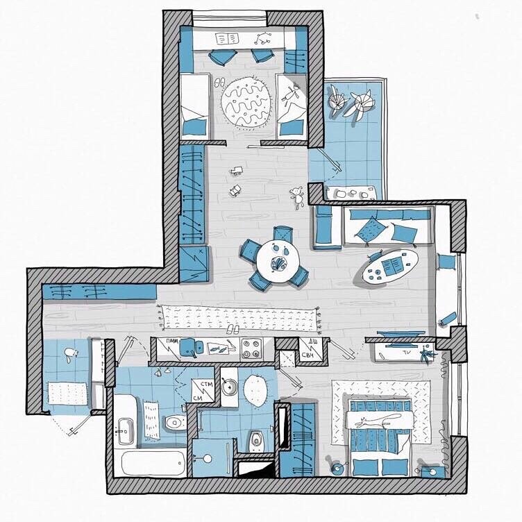 Планировки — это то, что мы любим делать больше всего на свете! Сегодня мы покажем одно из наших планировочных решений — двухкомнатная квартира без внутренних несущих стен. Такие квартиры еще называют «квартирами со свободной планировкой», но это не совсем верное определение — ведь основные зоны обозначены, и перенести санузел в спальню не получится. Свободная планировка — это просто отсутствие стен. Это не самая сложная планировка, с которой нам приходилось работать, но она довольно интересна. Во-первых, в квартире довольно большой холл странной формы. Во-вторых, здесь не так много окон, но есть балкон. Заказчикам хотелось иметь большую кухню, которая могла выполнять и функцию гостиной, а ещё — детскую, спальню и функциональный санузел. Смотрите в видео, с чем нам пришлось работать и что у нас получилось в итоге. Если вам интересно наблюдать, как дизайнеры работают над планировками, подписывайтесь на наш проект Битва Планировок — дизайнеры получают задание на планировку и пытаются пр
