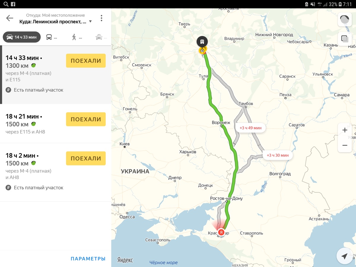 Встав в 6 утра, через полчаса мы уже ехали по Краснодару, в сторону Москвы. 1342 км и почти 14 часов в пути. Правда проехав 38 км и обновив карту выяснилось, что время чуть чуть увеличилось. Где-то появились пробки. Ну да ладно. Не смертельно. Сегодня понедельник, а значит должны проехать без пробок. По крайней мере без больших. Через 4 часа мы остановились позавтракать. Кофе, круассан. И снова в дорогу.