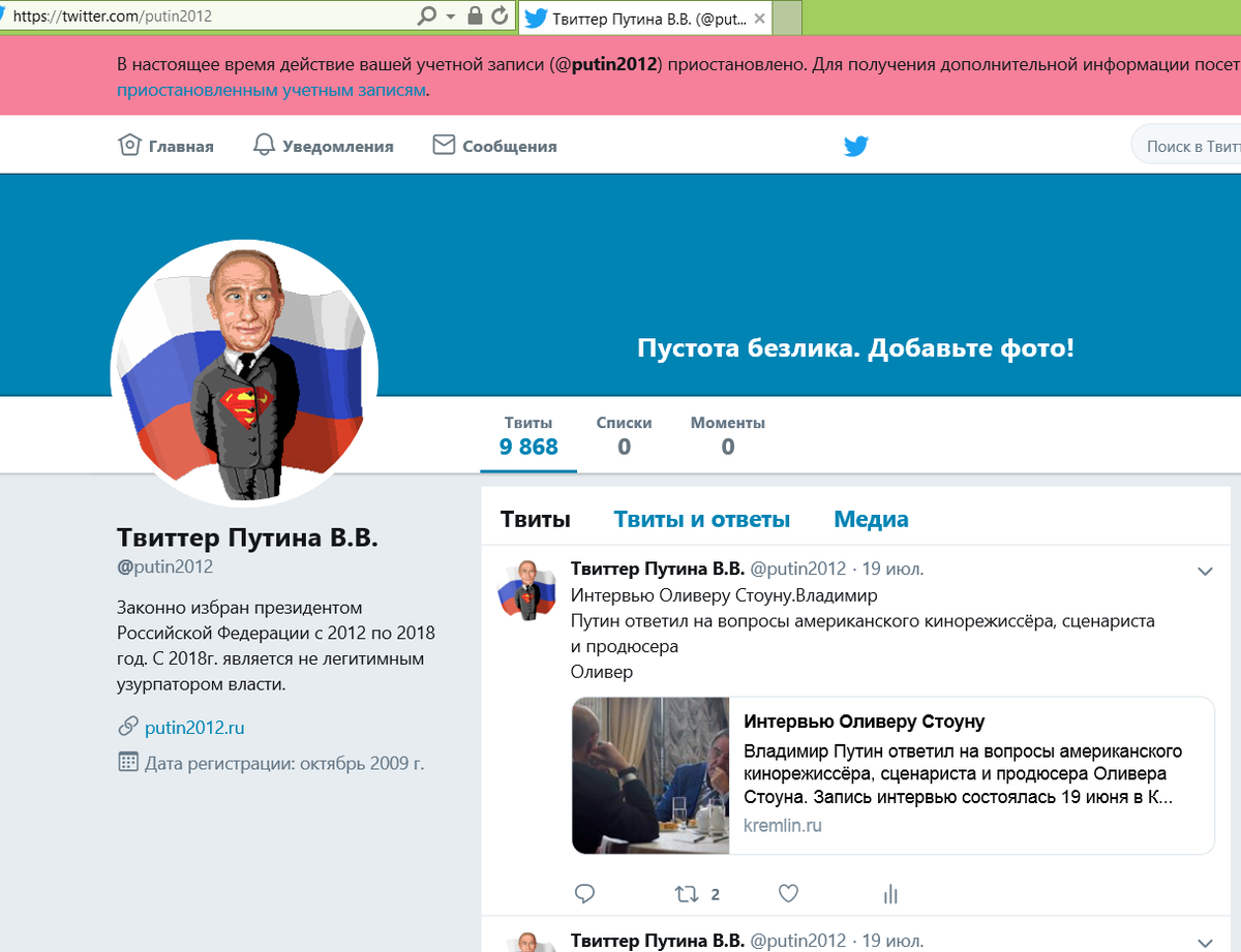 По прошествии 10 лет Твиттер взял и заблокировал аккаунт @putin2012. В аккаунт автоматически копировались официальные новости с kremlin.ru. Интересно, что другие всевозможные пародийные аккаунты, типа Перзедент Роисси - прекрасно продолжают работать. К созданию таких пародийных аккаунтов, как известно, и приложили руки сотрудники администрации президента, вот их-то и не банят.
