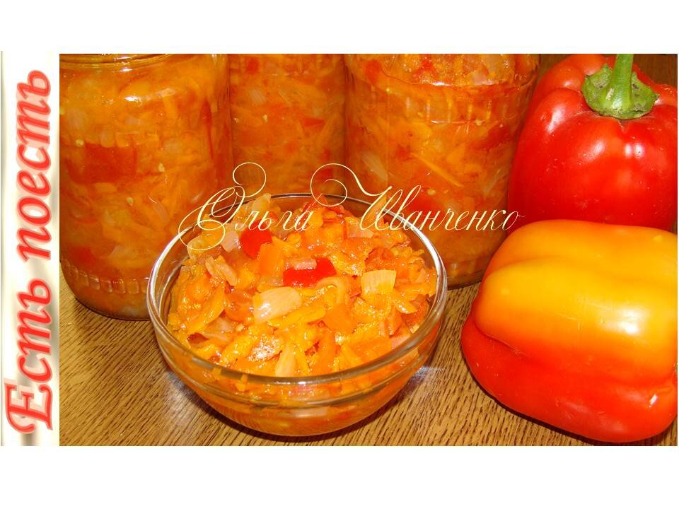 Этот овощной салат - родом из моего детства, что называется "бабушкин рецепт". Он всегда был самым любимым из домашней консервации. Очень просто делается, а получается вкусно! Регулируйте количество помидоров сами, если любите погуще - положите их поменьше. Блюдо отлично подходит как гарнир к мясу. Хорошо сочетается с рисом и макаронными изделиями. Можно и как самостоятельное блюдо. помидоры - 1 кг, морковь - 500 гр. перец болгарский - 500 гр. лук - 500 гр. масло подсолнечное - 120-150 мл. , соль (каменная) - 30 гр. сахар - 40 г. Порезать лук, перец и помидоры. Морковь натереть на крупной терке. В кастрюле разогреть масло и положить лук, довести его до полуготовности. Добавить морковь. Размешать, накрыть крышкой и тушить на среднем огне 10 мин., периодически помешивая. Потом положить перец, размешать, накрыть крышкой и тушить еще минут 5. В конце добавить помидоры, соль и сахар, размешать. Можно попробовать на вкус, если Вам мало соли или сахара - добавьте. Варить под крышкой еще 1