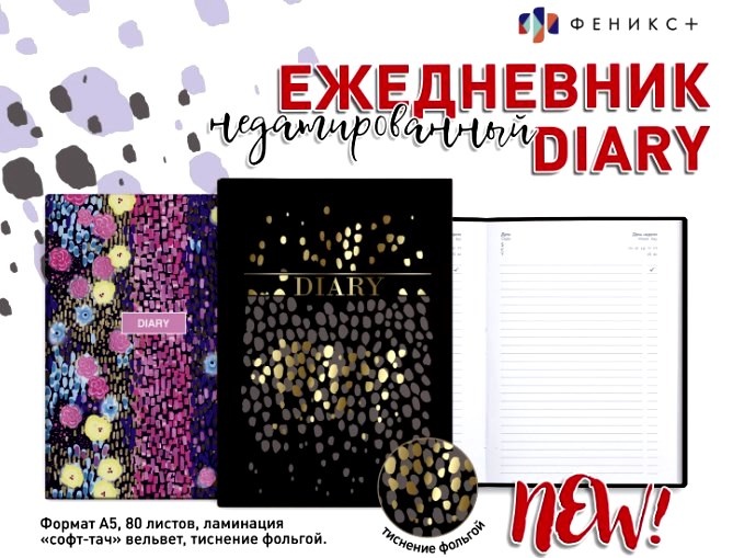Новинки офисной коллекции от "Феникс+". Ежедневник недатированный DIARY в твердом переплете, обложка с авторским дизайном, декорирована тиснением фольгой и ламинацией "софт-тач" вельвет. Внутри - недатированный блок с печатью в одну краску, 80 листов, формат А5. Источник - kanzoboz.ru