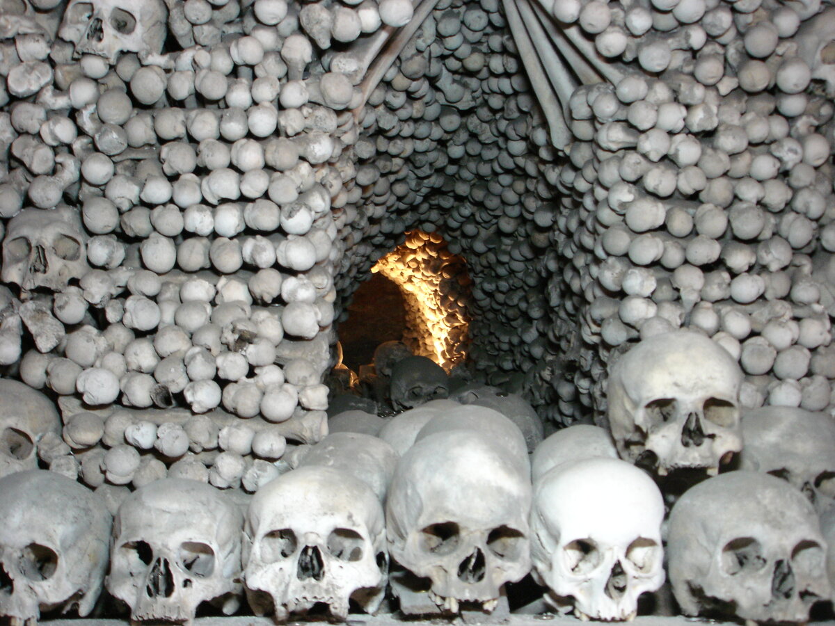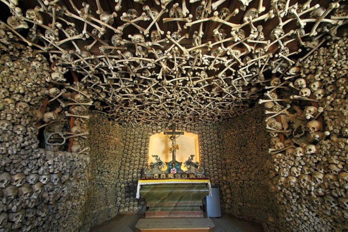 Я вообще не шучу. Прямо около столицы Чехии стоит непримечательная с виду церковь, все внутреннее убранство которой целиком состоит из человеческих костей. Память о чуме Не заходите, если не готовы к такому «приятному» зрелищу. Слева вас ждут человеческие кости. Справа — тоже, вот, ножки, ручки. Вот люстра из тазобедренных костей. Вот целая пирамида черепов — больше двух метров. Кости, выложенные крестиком. В общем, все, все костное. Как же так получилось? Давным-давно, нет, не в прошлую пятницу, а в 1218 году в городке Кутна-Гора в 70 км от столицы Чехии жестоко свирепствовала чума, выкосив столько населения, что кладбища не справлялись. От чумы погибло по разным данным, от 30 до 60 процентов населения Европы. Тут болезнь разошлась не на шутку, так, что захоронение трупов на прежних кладбищах не представлялось возможным. Тогда-то и открылась дорога вторичным захоронениям. Старые кости начали складывать в часовни - костницы, а новые трупы — хоронить. Вот пишу, и дрожь пробирает. Как