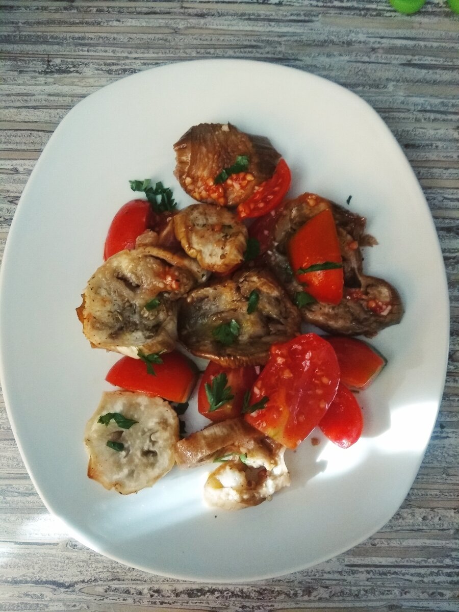 Добрый день , Товарищи! В сезон баклажан хочется готовить их как можно чаще и душа требует экспериментов! Делюсь с Вами моим любимым ссалатом из баклажан , который съедается очень быстро и в огромных количествах! Рецепт из Греции .Такой салат не стыдно и на праздничный стол подать - настолько яркий и вкусный! А готовится он довольно быстро и просто! Итак приступим! Для приготовления нам потребуются следующие продукты: - Баклажаны 500 грамм - Помидоры 500 грамм *Вы можете брать любое количество овощей, сочетание должно быть 50 на 50. 1)Для начала порежем баклажаны кружочками и вымочим в воде 10-15 минут. 2)После выкладываем на противень смазанный маслом кружки баклажанов и солим их с одной стороны, после того как они зарумянятся и будут практически готовы, переворачиваем на другую сторону, но уже не солим. Обычно этот процесс не занимает много времени, 20 минут в среднем. 3)Тем временем режем свежие помидоры на крупные части, добавляем к ним мелко рубленный чеснок, перец