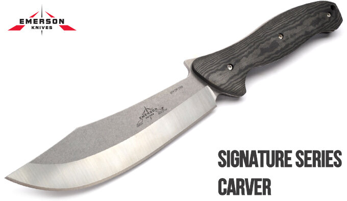 Emerson Knives Inc. продолжают развивать идею ножей для готовки мясных блюд, добавив в раздел "скорого в продаже" новую модель Carver из ограниченной серии Signature Series (серийный номер и подпись мастера) с нескладной цельной конструкцией клинка и хвостовика-рукоятки. Обновленный и более мобильный относительно классических моделей нож для разделки мяса (англ. carving knife) имеет 14,9 см клинок "сабельной формы" из стали 154CM с шлифованной поверхностью, которая подойдет почти для всех задач на кухне при работе с мясом. Вытянутое выпуклое лезвие с закругленным загибом к кончику, идущее после полукруглой выемки (дульки), переходит в спуски на половину высоты клинка, а затем в загнутый обух со скосом в конце. Для упора пальцем сделан фирменный выступ "Wave" перед длинным обухом, который также можно обхватить при необходимости развития большого усилия. Составная рукоятка с загибами под указательный палец и мизинец, центральной выпуклой частью и изгибающейся спинкой под ладонь оснащаетс