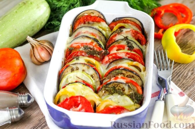 Кулинарные фантазии и классика безумно вкусного блюда, особенно актуального в сезон свежих овощей. Рататуй классический - оригинальный рецепт французского блюда из помидоров, кабачков, болгарского перца, лука и чеснока. Кабачки, лук и помидоры выкладываются на овощной соус и поливаются чесночной заправкой с зеленью и специями. Если вы любитель кабачков или у вас в избытке имеется именно этот овощ, приготовьте кабачки «А-ля рататуй» с грибами. Чтобы придать блюду пикантности, кабачки с шампиньонами и свежей зеленью до запекания маринуются в соевом соусе с растительным маслом. Если планируете выехать на природу, вам пригодится рецепт рататуя в фольге на мангале. Для такого блюда овощи нарезаются не кружочками, а кубиками, и готовятся на открытом огне. Зато и на отдыхе можно насладится ароматным рататуем. Очень оригинальным получается рататуй с виноградом.Свежий спелый виноград насыщает блюдо нежным кисло-сладким привкусом. Очень здорово такой рататуй сочетается со свежим хрустящим хлеб