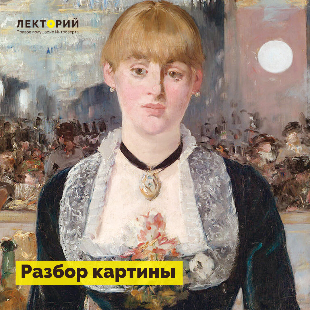 Центр картины занимает девушка за барной стойкой. Она смотрит прямо перед собой, но не на нас, зрителей, а словно сквозь нас (сравните с направленным взглядом «Олимпии»). Как и полагается, на барной стойке стоят различные бутылки. И мы видим занятный задний план – это и есть то самое пространство «Фоли-Бержер», кафе-концерта, где парижская публика смотрела представления и выпивала (как удобно, когда буфет находится прямо в концертном зале, да?). И это пространство мы видим... в отражении. Зеркало