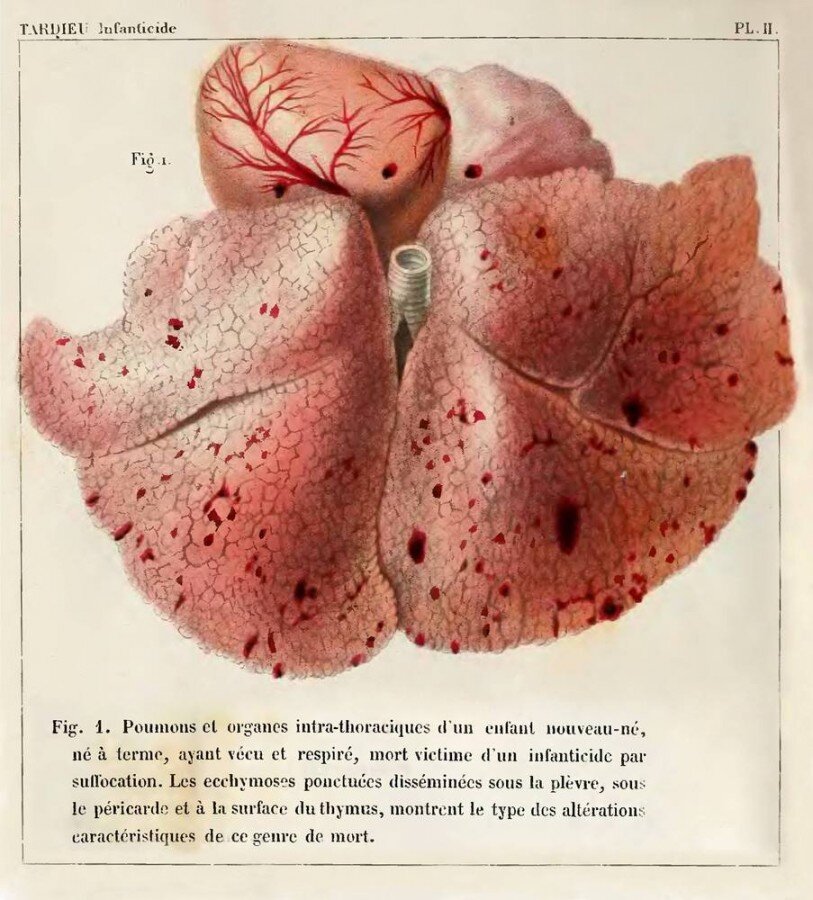 Иллюстрация в приложении к монографии Амбруаза Тардье « Трактат о судебно-медицинском исследовании при детоубийстве», 1868 г. Подпись к иллюстрации: «Легкие и внутренние органы грудной полости новорожденного, доношенного, рожденного живым и дышавшего, умершего от удушения - жертвы детоубийства. Точечные экхимозы, диссеминированные под плеврой, перикардом и оболочкой тимуса свидетельствуют об