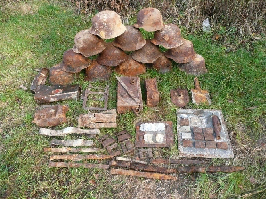 Вот бывает такое на копе по войне - можешь нарезать за день 10 километром и найти два-три противогаза и горсть гильз, а можешь напороться на небитое место! НЕ-БИ-ТО-Е МЕ-СТО! Правда, звучит как музыка? Как припев, который хочется переслушивать???))) Вот на такой пятачок парни и вышли - если разобраться, все было на участке 20 на 30 метров. Но сколько находок! Шлемы, ремни, пряжки, жетоны, штык ножи, сапёрки! давайте я опущу вопрос о том, были ли там кости фрицев или нет, хорошо? Магазины от МР, КОРОБКИ ИЗ ПОД ПАТРОННЫХ ЛЕНТ! 14 ШЛЕМОВ! Бабло на бензин, еду, пинпоинтер, одёжку, палатку - отбили всё! А вот здесь уже то, что с собой особо не взять, ну если только пустые бронебойные 45-мм, да и то как ММГ, по 300 рублей за штуку! Еще фляжку да ложки. Башку колотухи на месте разряжать не горело, 50-мм мину тоже, патроны ПТР и так уже на сувенирку шли в прошлый раз. РГДэшные рубашки тоже хабаром считаются. Всё остальное прикопали чуть в стороне - у деревца. От нечего делать повысыпа