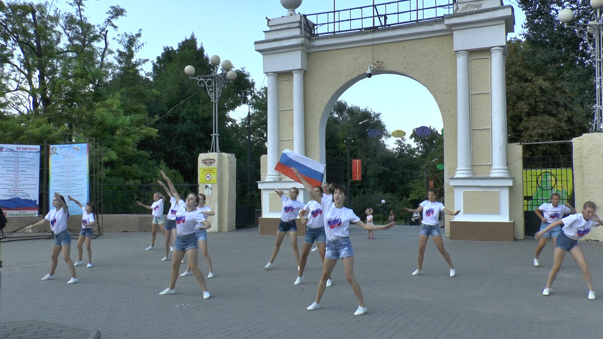 В Таганроге отметили День российского флага . В честь этого у дворца молодежи города состоялся флешмоб. Это новая современная форма массовой акции молодежи . Небольшое выступление юных граждан города с триколором состоялось у стен Дворца молодежи и у входа в парк им Горького.