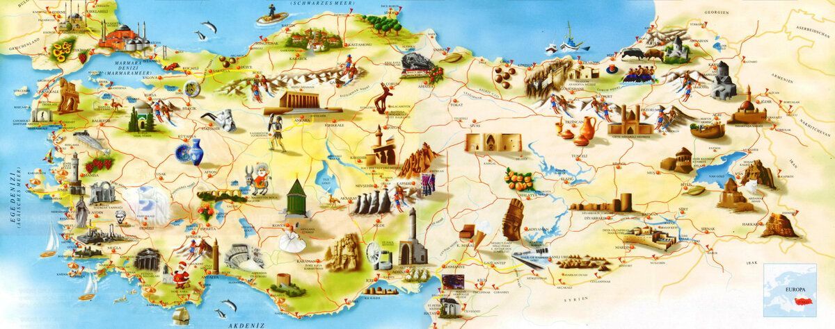 В Мармарис туристы едут не только за пляжным отдыхом и великолепными видами гор, простирающимися по всей панораме города, но и за яркими впечатлениями, коих Турция предлагает немало. Для того чтобы более наглядно понимать расположение наиболее популярных достопримечательностей, воспользуйтесь представленной картой.