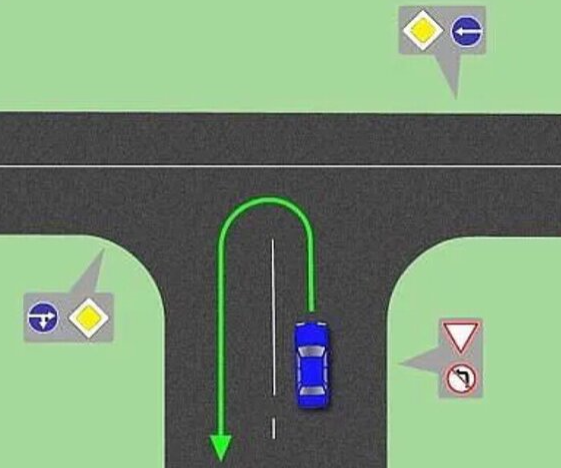 И так, водитель автомобиля подъезжает к перекрестку. Он видит знаки "Уступить дорогу" и "Поворот налево запрещен". В этой ситуации водитель не собирается поворачивать, а хочет сделать разворот, а как мы знаем из правил, разворот нам резрешен.