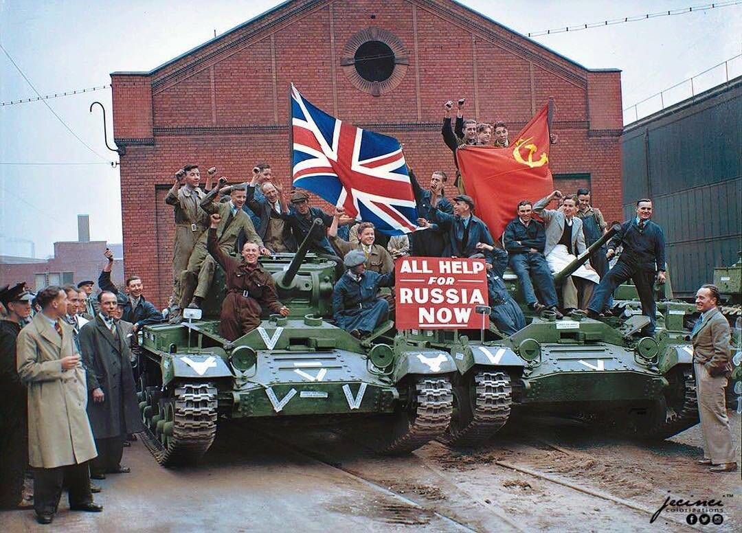 Рабочие компании Birmingham Railway Carriage and Wagon Company празднуют передачу первого из многих танков Valentine MK2, изготовленных для российского фронта, перед мастерской в Сметвике - 22 сентября 1941 г. Знаки «Победа-В», украшающие танк, были сделаны из наклеек с надписью: «Ускоряй танки - для России!» Рабочие держат флаг Союза и российский флаг, и у многих кулаки подняты в знак коммунистического приветствия. Присутствовали посол России в Великобритании Иван Майский и Гарольд Макмиллан, который в то время был парламентским секретарем в министерстве снабжения. Обращаясь к рабочим в Сметвике, Майский заявил, что танки «не ржавеют в бездействии», но будут отправлены на фронт, как только они прибудут в Россию. Первые английские танки вступили в бой 20 ноября 1941 года в битве под Москвой.
