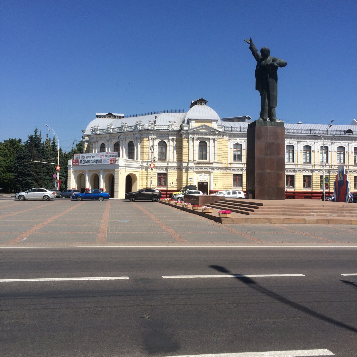 Самый простой способ познакомиться с Тамбовом - исходить его вдоль и поперек. Тамбов вдоль - это сонные камыши речки Цна и набережная. А Тамбов поперек - это динамичные улицы с гордыми советскими именами. Интернациональная улица гордо прорезает Тамбов прямой чертой от вокзала до набережной, упираясь в Казанскую колокольню. Где-то в середине улицы стоит Ленин, который всей своей позой лезгинки показывает, что Тамбов в этой части - динамичный. За Лениным - драматический театр, бывшее дворянское собрание - конечно, не такое грандиозное, как в Курске, но тоже красивое. А вот Интернациональная улица упирается в колокольню. Когда улицу называли Интернациональной, колокольни не было, ее восстановили. Главное в колокольне тамбовского Казанского собора - что это самое высокое здание Тамбовской области и одна из самых высоких колоколен в мире (107 метров), а в России - так вообще третья самая высокая. Главное для туриста то есть, для пономарей это может и неважно совсем. Сам Казанский собор - ос