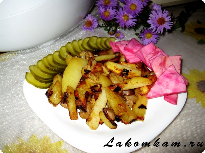 Начался грибной сезон! И конечно самое вкусное и любимое блюдо, которое приходит в голову, это жареная картошка с лесными грибами. Иногда можно побаловать себя таким высококалорийным, но очень вкусным и хрустящим блюдом. Грибочки подойдут в принципе любые, у меня были синеножки. Хорошо жарить все это ещё и на сале, тогда вообще можно съесть всю сковородку!