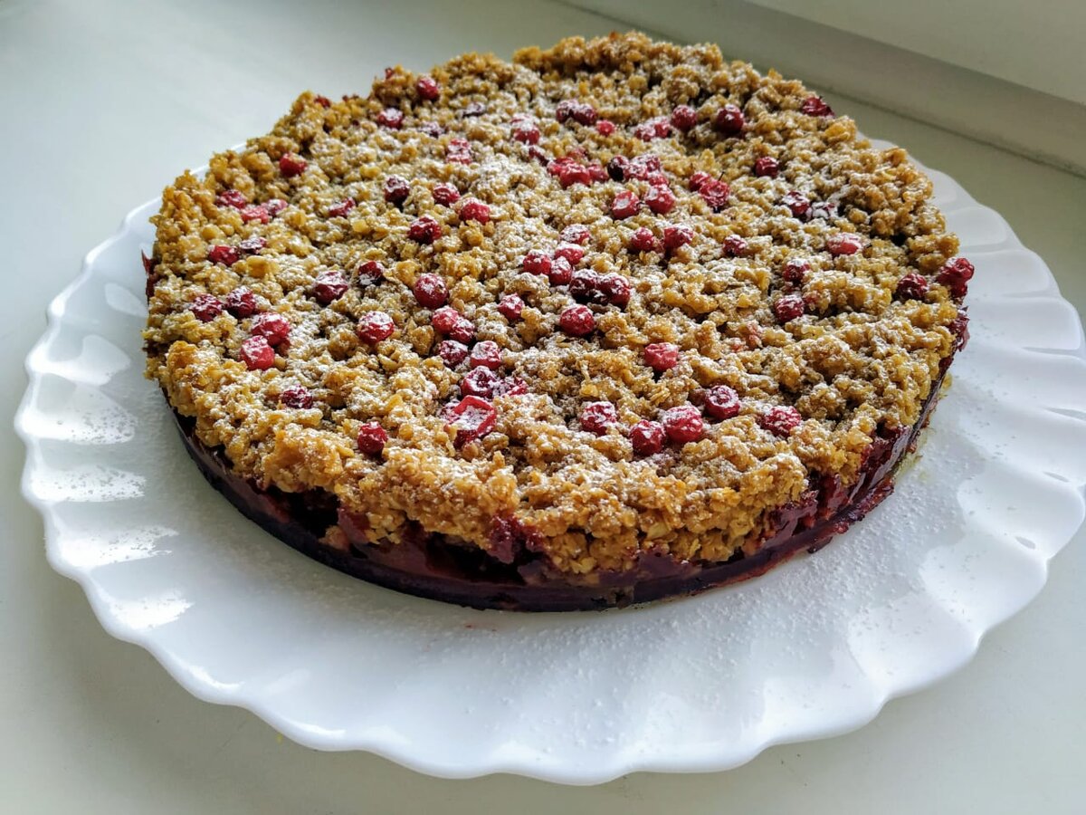 После работы, выходя из метро, я увидела бабушек, продающих грибы-ягоды. Глаз мой упал на стаканчики с брусникой. Я сразу представила всю кислоту и инстинктивно сглотнула слюну. А ведь был же у меня рецепт крамбла, который я давно хотела испечь, но все никак руки не доходили. Как раз и брусника подвернулась. Купив маленький стаканчик ягод, я пошла домой, чтобы поскорее испробовать новый рецепт. Надо сказать, получилось очень быстро, необычно, насыщенно и хрустяще. Делюсь с вами рецептом крамбла с брусникой и яблоками. Крамбл: Овсяные хлопья 150 гр. (я брала быстрой варки); Коричневый сахар 120гр.; Сливочное масло 120 гр. Начинка: Брусника 80гр. (можно любую кислую ягоду); Яблоки 350гр (любые); Кукурузный крахмал 15гр. (можно не добавлять, если начинка не слишком сочная. Крахмал используется для стабилизации начинки); Корица 1 ч.л.; По желанию можно добавить цедру апельсина или лимона для яркого аромата. Совет: используйте только верхнюю часть цедры до белого слоя, тогда она не да