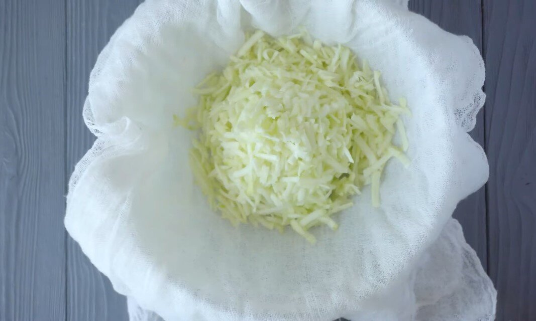 Для кабачкового рулета нам нужны: Кабачок – 300 гр. Яйца – 4 шт. Соль – по вкусу Чеснок сушенный – 0,5 ч.л. Паприка копченная – 1 ч.л. Петрушка – 2 веточки Сыр – 130 гр. Масло для жарки – 15 мл. 1) В глубокую миску застелите марлю, сложенную в 4 слоя. 2) Натрите на крупной терке туда один кабачок. Теперь соберите края в мешочек и отожмите весь сок. Переложите в глубокую посуду. 3) Добавьте 4 яйца, мелкопорубленную зелень, у меня петрушка. 4) Обязательно воспользуйтесь приправами, чтобы вкус был ярче. Я взяла копченную паприку, сушенный чеснок и морскую соль с травами. 5) Добавьте пол чайной ложки чеснока или используйте свежий – 1 зубчик, чайную ложку паприки копченной и соль по вкусу. 6) Все вместе перемешайте. 7) На плите нагрейте сковороду и налейте масло. Его нужно будет добавить только в самом начале. 8) Выложите тесто, равномерно распределяя по всей сковороде. 9) Жарьте на огне чуть меньше максимального. 10) Когда яйцо сверху схватиться, посыпьте тертым сыром и о