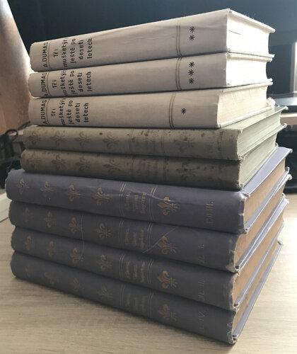 Потом проект был дополнен изданиями трилогии от Антонина Свецани, для книг которого Станислав Гудечек нарисовал отдельные комплекты полностраничных иллюстраций, кои мы начали публиковать на вклейках. Тут меня в будущем ждал небольшой неприятный сюрприз: в тот момент, когда готовился первый том, в продаже не было полного комплекта книг Свецани, можно было купить только два тома с "Тремя мушкетерами". Я их приобрел, потом довольно быстро нашел еще три тома с "Двадцать лет спустя" — а вот отдельное издание "Виконта" (это шесть томов) я искал год и так и не нашел, причем в какой-то момент из продажи пропали и комплекты (они появились в продаже после выхода наших "Трех мушкетерах") и я уже отчаялся найти хоть какой-то вариант. Но в июне этого года я наконец нашел в продаже комплект, приобрел его, получил в начале июля — и наше издание "Виконта" начало обретать какие-то реальные сроки. Для полноты истории надо вернуться к "Трем мушкетерам" и "Двадцать лет спустя" — теми чешскими изданиями, которые были мной приобретены в самом начале дело не ограничилось — в нашей публикации "Три мушкетера" сопровождались комплектом иллюстраций Мориса Лелуара, отсканированными с первого французского издания (чешское осталось не у дел), в случае же с "Двадцать лет спустя" я приобрел еще и французское издание с иллюстрациями Незьера и при подготовке отбирал лучшие варианты печати по этим двум книгам: чешской и французской. К слову сказать, чешское издание почти всегда побеждало французское (бумага гораздо лучше), но во французском было довольно много иллюстраций, пропущенных в чешском. Пора показать вам очередную фотографию, пусть это будет трехтомник "Виконта" (в каждом томе по два оригинальных, переплеты не родные) от чешского издателя Антонина Свецани: