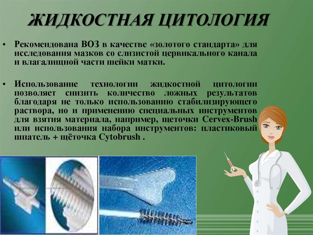 Жидкостная цитология шейки матки – это «золотой стандарт» диагностирования неоплазий слизистой оболочки канала и влагалищной части маточной шейки при подозрении у пациентки на рак или дисплазию. Благодаря такому способу диагностики можно обнаружить рак на самых ранних стадиях развития, что увеличивает шансы на полное излечение. Показания Жидкостная цитология шейки матки как гинекологический метод исследования помогает в выборе наиболее эффективных способов лечения онкозаболевания. С помощью данного метода можно определить наличие злокачественных клеток, а также степень развития болезни. Цервикальный скрининг целесообразно проводить с началом половой жизни. В группу риска можно отнести женщин с вирусом папилломы. Показания для проведения исследования: планирование беременности; нарушение или сбои менструального цикла (слишком короткий или удлиненный цикл, частые задержки); бесплодие; наличие нескольких сексуальных партнеров; гинекологические патологии вирусной этиологии (остроконечные