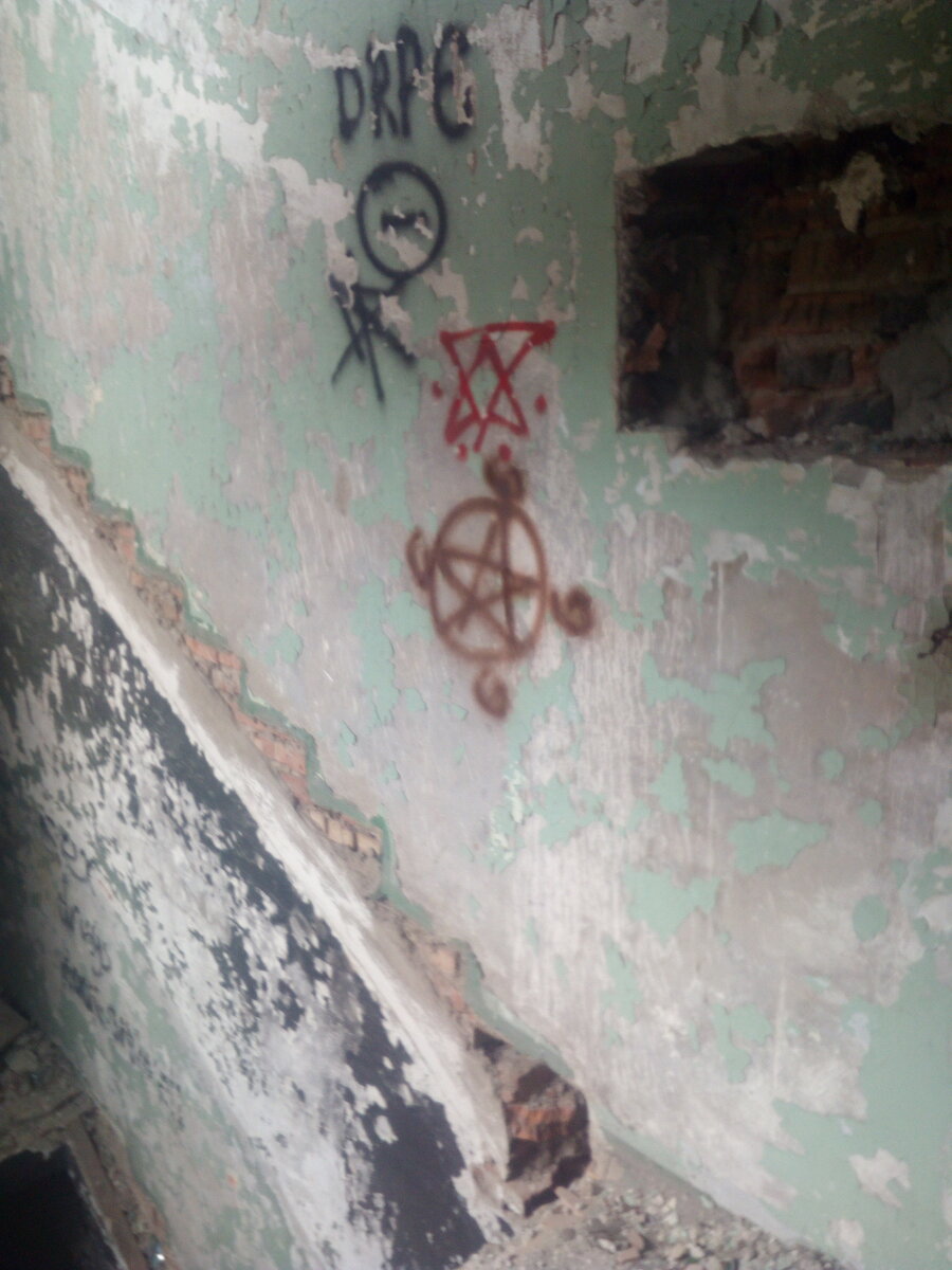 Один раз я с друзьями решил пойти на исследование заброшенного здания. Это была старая психиатрическая больница. На вид ничего не обычного - нету окон, дверей. Весь пол в мусоре. Но внутри, сразу же на первом этаже, я заметил рисунок на стене - пентаграмму. Пентаграмма - звезда, обведённая в круг, которую по слухам используют для жертвоприношения в ритуалах. Так же она была на полу второго этажа Как видите, в одном из треугольников звезды есть знак свастики - знак Гитлеровской германии. Пройдя немного дальше я увидел это. Цифра 6 - дьявольское число. И отношение к нему в церкви довольно плохое. А так же это - Выцарапанную надпись "тульпа". Тульпа - галлюцинация, из-за которой у тебя появляется воображаемый друг. На одной из стен был найден этот рисунок. На нём изображён енот, глаза которого истекают кровью Возможно все эти надписи были сделаны самими пациентами. Или может быть это чья - то шутка. Ответа я к сожалению не знаю. Рисунки выглядят действительно пугающими. Такие здания мо