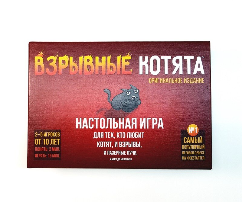 Все любят котиков, однако мало кто знает, что иногда они могут приносить не только мурррррчащее счастье, но и огромный взрыв! Настольная игра «Взрывные котята» — один из самых популярных проектов на Kickstarter, собравший почти 9 миллионов долларов и захвативший сердечки более 200.000 человек. Наконец-то игра появилась на русском языке, и сразу же получила огромную популярность. Мы, естественно, не смогли пройти мимо и решили собраться поиграть. Игра идеально подходит тем, кто только начинает играть в настольные игры, или тем, кто ленится читать огромные кипы правил, условий, возможностей и так далее. Огромный плюс игры открывается сразу на лицевой стороне коробки — «понять: 2 мин, играть: 15 мин». Взрывные котята — карточная игра для 2–5 любителей пушистых, суть которой максимально проста — игрок, вытянувший из колоды взрывного котенка, «взрывается» и выбывает из игры. Собравшись вместе игроки получают на руки по 8 карт из колоды, каждая из которых имеет собственное свойство. Среди к
