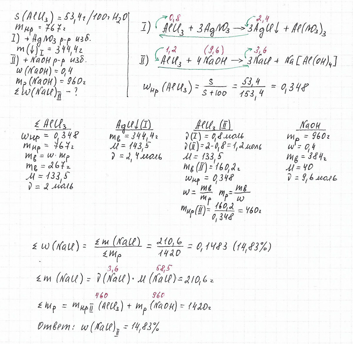 4) Делаем предварительные расчеты: определяем количество вещества AlCl3 в исходном растворе, количество вещества AgCl и NaOH.