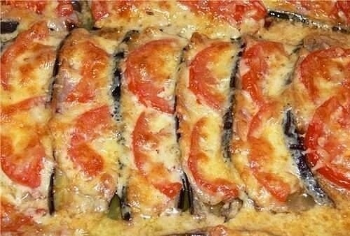 Баклажаны под шубкой Состав: 2 баклажана бекон ломтиками 2-3 помидора сыр(твёрдых сортов) НИЧЕГО НЕ СОЛИТЬ!!!!!!!!!! Баклажаны помыть,нарезать вдоль(толщина в палец).Обжарить на растительном масле с двух сторон. Нарезать помидорки кружочками(у меня баклажаны были маленькие, поэтому порезала кружочки помидорок ещё пополам). Сыр можно порезать просто пластинками, такими же как баклажаны. У меня остался натёртый сыр, поэтому в этот раз его использовала. Теперь всё укладываем слоями: Кладем ломтик баклажана,так чтобы он немного опирался на стенку посуды, в которой будите запекать блюдо. На него кладёте ломтик бекона, на него помидорки. Затем, если у вас нет потёртого сыра, то укладываете кусок сыра. Если же сыр потёрт, то кладёте следующий ломтик баклажана (немного в нахлёст на первый кусок). И так до окончания баклажанов. После этого засыпаем всё сыром и в духовку (170 градусов) До золотистой корочки.