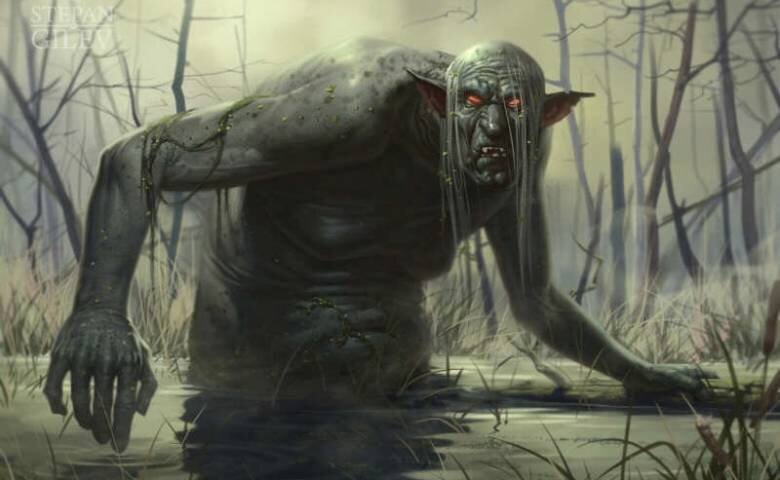 «Болотник — один из нетипичных представителей нечисти, обитающей на болоте. В описании внешнего облика болотника наблюдаются некоторые разногласия, что главным образом связано с малоподвижным образом жизни этого существа в крайне малодоступных местах. По одним данным, это малоподвижное придонное существо, угрюмый и безглазый толстяк со слипшимися волосами, телом, покрытым толстым слоем грязи, рыбьей чешуи, улиток и тому подобного. По другим описаниям — это старик с серой шерстью, длинными руками и не менее длинным закрученным хвостом с широким желтоватым лицом (под цвет болотной жижи) и гусиными (по другим описаниям — жабьими) лапами вместо ног. У болотника всегда большие выпученные глаза, такой же большой живот и огромная, спутанная, сбившаяся в колтун борода.