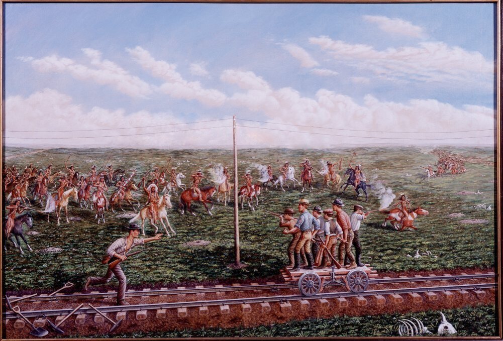 Тем приятнее было мое удивление, когда я узнал, что данная история не выдумка досужего художника! В русскоязычном Интернете есть статья о нападении индейцев на дрезину с такой картинкой, но событие интерпретировано не верно и относиться к 6 августа 1867 у Плам-Крик, а это произошло 28 мая 1869 года у Фоссил-Крик.