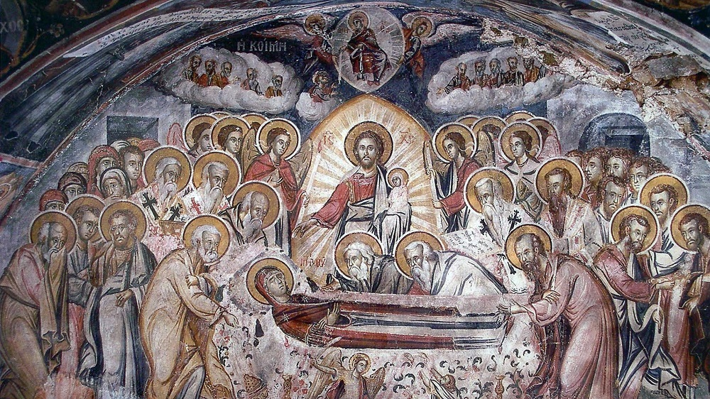 - За три дня до смерти Богородице явился Архангел Гавриил и предупредил ее. Дева Мария очень хотела проститься со всеми апостолами, которые были разбросаны по земле и проповедовали Евангелие. Чудесным образом они были перенесены в дом родителей апостола Иоанна, в котором с момента Вознесения пребывала Богородица.