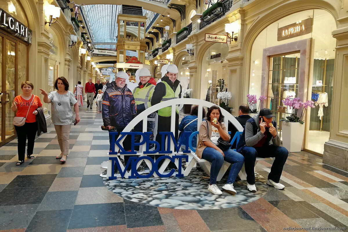 Вот вам свежие фотографии из ГУМа. Вчера была. У меня дежавю. То же самое было в прошлом и позапрошлом году. На третьей линии выставка, посвященная Крымскому мосту, а в фонтане плавают арбузы и дыни.