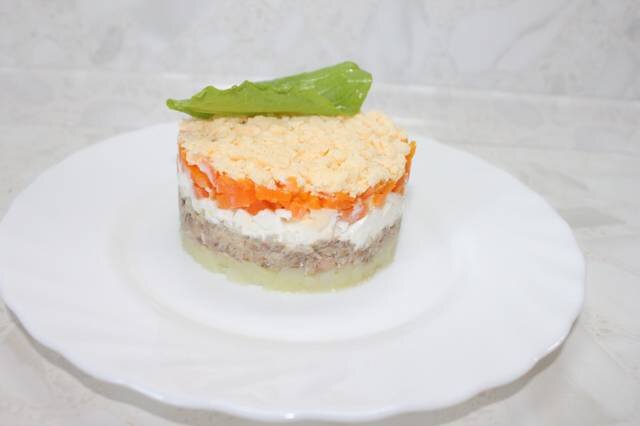 1 банка консервированной рыбы 2-3 шт картошки 1-2 шт моркови 4-5 шт крупных яиц По вкусу лук репчатый По вкусу майонез По вкусу соль Способ приготовления Шаг 1 Картофель и морковь отварить до готовности. Яйца варить 8-10 мин. Все остудить. Шаг 2 Отделить белки от желтков и натереть на мелкой тёрке. Морковь и картофель так же натираем на мелкой тёрке. Лук мелко нарезать. Слить сок/масло с консервированной рыбы и размять вилочкой. Шаг 3 Теперь приступим к сбору нашего салата. Всё укладываем слоями: Первым слоем - Картофель + майонез Второй слой - рыба +лук+ майонез. Третий слой - яйца Четвертый слой - Морковь+майонез Пятый слой - Желтки от яиц. Украшаем по желанию! Приятного аппетита.