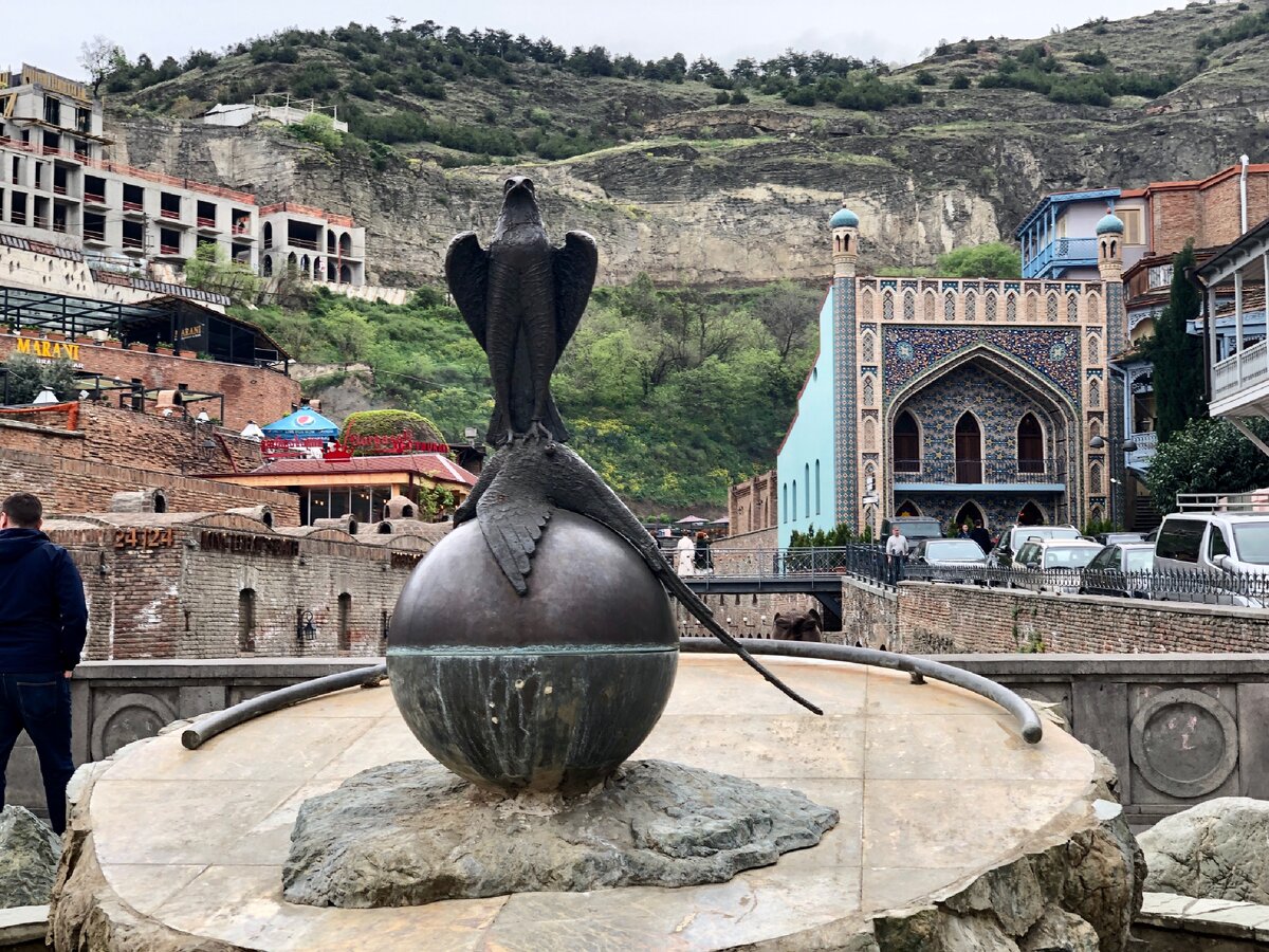 Обратите внимание на памятник соколу, в честь которого в этом месте построили город, если верить легенде. Их аж 3 с разными концовками, где царь Вахтанг прибыл сюда с любимым соколом. Выпустил он сокола на фазана и завелась драка, по одной легенде фазан и сокол упали в источник и погибли, по второй фазан сварился, а сокол выжил. Ну и наконец по-третьей, сокол выжил, но поранил лапки, после чего подлетел к источнику и все зажило