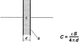 S – площадь поверхности обкладок в м2, d – расстояние от обкладок, м, С – емкость, Ф, е – проницаемость диэлектрика. Все показатели выражены в системе СИ. Формула подходит плоскому конденсатору, помещают две пластины из металла с выводами, диэлектрик не нужен, так как им будет являться воздух.