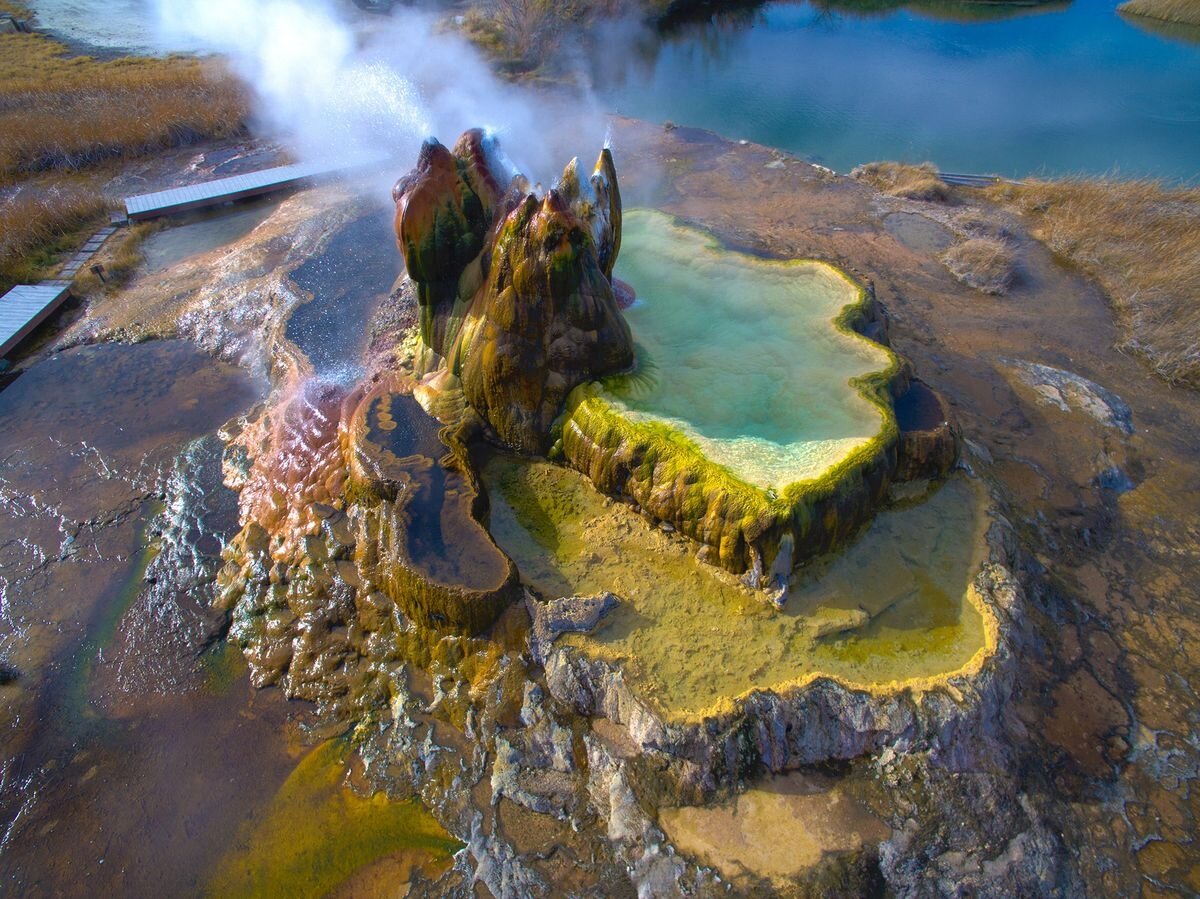 Гейзер Флай проснулся относительно недавно – в 1960 году. С тех пор его фотографии публиковались во всех популярных географических журналах мира. Я не удивлен. Он фантастически красив. Флай пробуждается. Гейзер получил свое романтическое название за то, что струи воды вылетают из него на 15 метров в высоту. Он действительно словно пытается улететь. Начало пробуждения гейзера было положено в 1916 году, при строительстве недалеко от этого места колодца, который много лет использовался местными жителями. А в 1960 году проснулся сам гейзер. Горячая вода и сейчас выходит на поверхность из земли, растворяя минералы и придавая гейзеру форму холма. Сейчас высота Флай – около полутора метров. А бактерии и водоросли, покрывшие этот небольшой вулкан, придали ему самый фантастический вид. Неудивительно, что тут, у Флай замечено паломничество фотографов. Любой уважающий себя географический журнал просто обязан иметь фотографию гейзера на своих страницах. Чудо природы на частном ранчо. А теперь