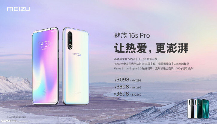 Сегодня компания Meizu официально представила свой флагман Meizu 16s Pro. У нового смартфона полноэкранный дизайн фронтальной панели, толщина корпуса всего 7,65 мм, а вес — 166 грамм. Meizu 16s Pro получит чипсет Qualcomm Snapdragon 855+, накопитель UFS 3.0 с максимальным объемом 256 Гб, 48-Мп основную камеру, широкоугольный объектив с автофокусом для пейзажей, Flyme 8. В Meizu 16s Pro использует дизайн кольцевой вспышки вокруг нижнего объектива и три датчика основной камеры. Основной датчик на 48 Мп (Sony IMX586) с диафрагмой f/1.7, четырех-осевой OIS, PDAF и размером пикселя 1.6 мкм. Есть супер-ночная сцена, портретный режим, HDR и распознавание сцен. Съемка видео с замедленной съемкой 480 кадров/сек и супер-широкоугольное видео (максимум Full HD), максимальное разрешение при съемке видео — 4K, 60 кадров в секунду. Остальные два датчика это 20 Мп (Sony IMX350, с диафрагмой ƒ/2.6, макросъемка 2,5 см) телеобъектив для зуммирования и сверх-широкоугольный 16 Мп датчик (Sony IMX481, ƒ / 2
