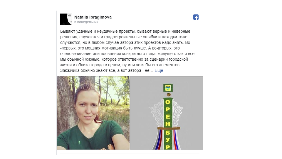 Конфликт по поводу неудачной стелы, которую должны были установить на въезде в Оренбург ко Дню города, до сих пор не утихает. Напомним, и.о. главного архитектора области Наталья Ибрагимова жестко раскритиковала макет, отметив, что работа не только низкая по качеству, но и неверно позиционирует город. Раскритиковали макет и в соцсетях. Горожанам показалась эта работа безвкусной и унылой. А в администрации Оренбурга сообщили, что реализацию проекта переносят, объяснив это тем, что вносятся конструктивные предложения по изменению дизайна. Участие в доработке эскиза принимают главный архитектор Оренбурга Георгий Проскурин и главный художник города Наталья Бровко. Во время не утихающих страстей автор проекта стелы был неизвестен, однако ситуацию исправила Наталья Ибрагимова. Она опубликовала на своей странице Facebook фото творца стелы и подписала следующим образом: «Бывают удачные и неудачные проекты, бывают верные и неверные решения, случаются и градостроительные ошибки и находки тоже