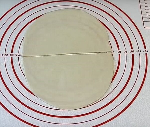 7. Возьмите один шарик теста и раскатайте его в овал толщиной около 3 мм. Разрежьте его пополам – это заготовка на два пирожка.