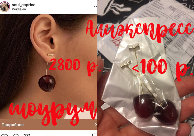 Частенько в Instagram я натыкаюсь на рекламу шоурумов, и все даже выглядит довольно симпатично... пока не посмотришь на цену. Так, я случайно нашла необычные серьги-вишенки за 2800. Пришлось найти похожие на Aliexpress. Конечно, есть небольшая разница в дизайне + надеюсь, что делаются не на одном китайском заводе. Дикая вишня Вес чувствуется, но в зависимость от вашей "нежности" можно отходить от нескольких часов до целого дня. Лично мне больше нравятся с вишенками поменьше (это другая пара). Но с ними не все так гладко. Я забыла покрыть их прозрачным лаком, и металл стал окисляться. Ссылки: "Большие" вишенки - 70 рублей. "Маленькие" - 44 рубля. Серьги в стиле Дольче Ну это просто роскошество. Глядя на эти серьги, хочется сразу впрыгнуть в образ шикарной итальянки в платье с открытыми плечами и бокалом вина в руке. Вполне могу представить, что такие серьги вписались бы в показ Dolce & Gabbana. Цена: 57 рублей. Серьги с сердечками Милые и минималистичные. Желтый металл, красное мал