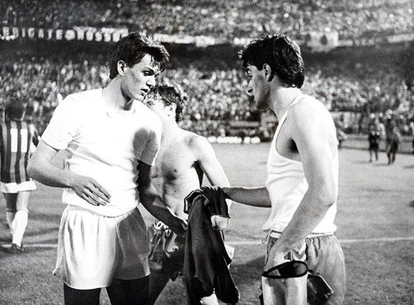 Паоло Мальдини и Мичел Гонсалес обмениваются майками после напряженного матча в рамках Кубка Чемпионов, который проходил на стадионе "Сан-Сиро".