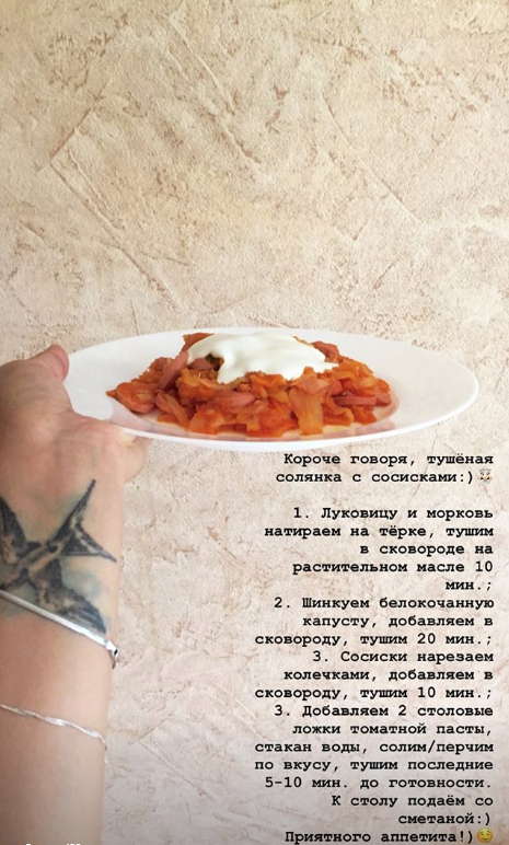 Добрый день, дорогой друг! Сегодня на ужин мы с тобой приготовим тушёную солянку с сосисками. Среднее время приготовления - 45 минут. Нам потребуется: 1. Белокачанная капуста; 2. Сосиски; 3. Репчатый лук; 4. Морковь; 5. Томатная паста; 6. Сметана; 7. Оливковое/растительное масло, соль/перец, другие специи. 1. Луковицу и морковь натираем на тёрке, тушим в сковороде на растительном масле 10 минут; 2. Шинкуем белокачанную капусту, добавляем в сковороду, тушим 20 минут; 3. Сосиски нарезаем колечками, добавляем в сковороду, тушим 10 минут; 4. Добавляем 2 столовые ложки томатной пасты, стакан воды, солим/перчим по вкусу, тщательно перемешиваем, тушим последние 5-10 минут до готовности. 5. К столу подаём со сметаной. Приятного аппетита!) Короче говоря, ставьте лайки, подписывайтесь на мой канал:) В комментариях делитесь рецептами, буду рада Вашей активности!)