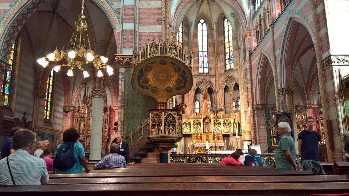 Храмы в Нидерландах есть разные: католические, протестантские, православные, мечети, синагоги...Старинные и современные. Иногда они представляют собой не только место для молитв, а могут использоваться для различных мероприятий. Я нашла данные статистики по религиозности за 2015 год. Католицизм - 23,7% Протестантизм - 15,5% Ислам - 4,9% Другие (буддизм, иудаизм, и т.д) - 5,7% Не относят себя ни к какому религиозному течению - 50,1% Итак, половина жителей Нидерландов не ходят в церковь. Многие храмы по причине простоя и необходимости хоть как-то окупать своё существование начали использоваться для самых разных целей. Когда мы гуляли по Делфту, то заглянули в один из красивейших старинных храмов. Местные жители собирались на мессу, и в то же время туристы могли посмотреть небольшую выставку современного искусства. В Гааге в сентябре проводится выставка для экспатов (т.е. приезжих наподобие нас). Выставка в церкви -это немного странно, но не пустовать же помещению? Оно служит для интер