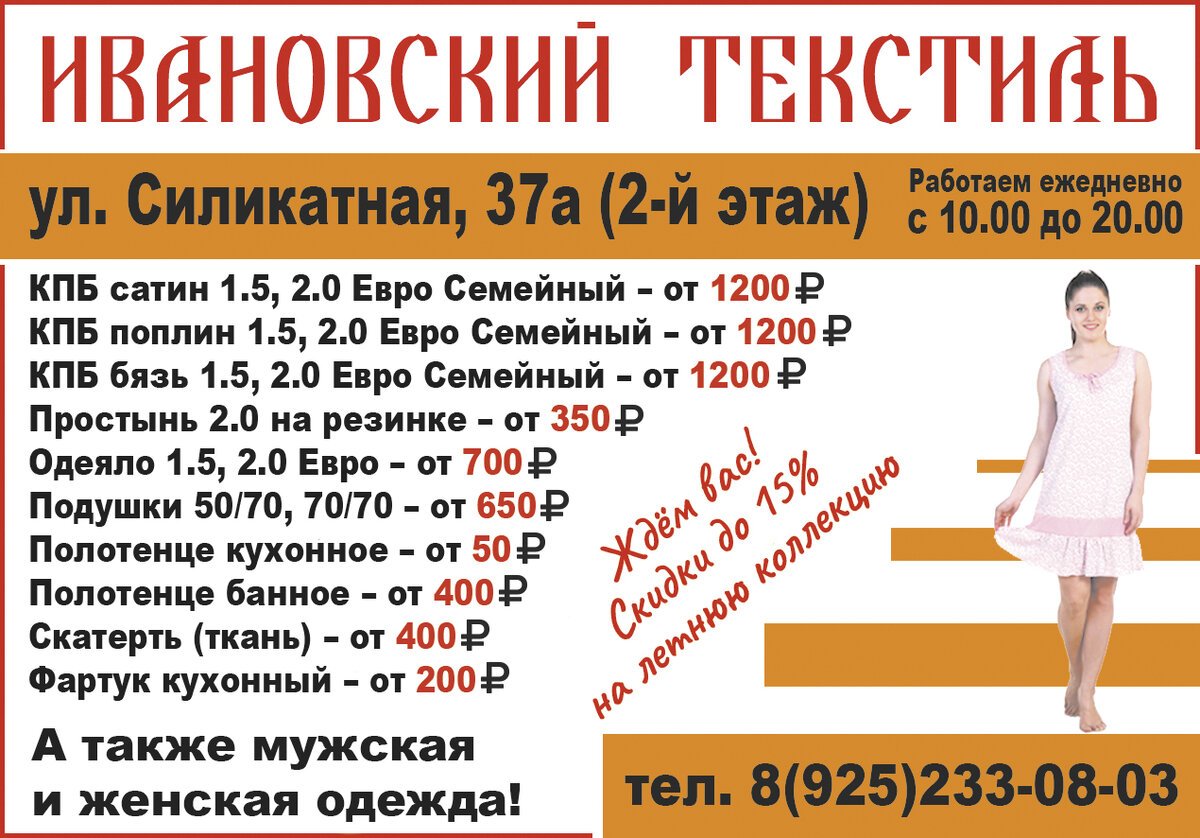Текстильная продукция из Иваново с давних пор считается одной из лучших. Теперь её можно купить рядом с домом."Ивановский текстиль" предлагает постельное белье, одеяла, подушки, полотенца,а также одежду из натуральных тканей.