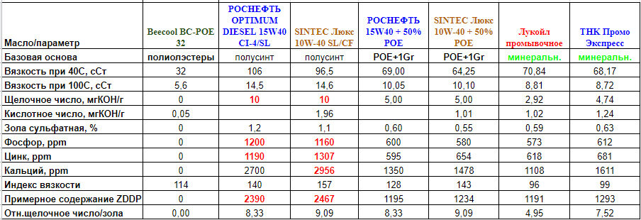Для начала посмотрим на анализы промывочных масел Лукойл и ТНК/Роснефть. Оба промывочных масла содержат приличное количество ZDDP — около 600ppm по фосфору (перестраховались на случай если дурики на этом поедут или того хуже — в поддельную 20ку лить начнут… и оно действительно не навредит), вязкость около 9сСт — W20, не содержат загустителя, индекс вязкости 9х выдает обычную минералку. В обоих присутствует небольшое количество кальция — моющий пакет для нейтрализации кислой среды от старого масла. При внимательном изучении дешевых масел 10W40 15W40 удалось найти два с известными анализами и подходящими параметрами — вязкостью, сожержанием ZDDP, кальция, щелочным числом. При разбавлении пополам с эстерами получается просто отличное не только промывочное масло, на нем еще и проехать можно около 150моточасов на обычном двигателе. Пакет получился конечно малозольным, зато посмотрите на золу 0,55-0,6% — прям шедевр из минералки, а не масло, учитывая 50% эстеровую базу. И даже щелочное около 5 что неплохо при такой золе. Недостатки моющих и противоизносных свойств компенсируются эстерами в составе. Вязкость ровно 10сСт при 100С — обычная "жидкая" 30ка. Из-за эстеров это нечто типа 5W30 либо 10W30. Мы точно промывочное масло похолостить изобретали? А получили минерально-эстеровую композицию с интересными параметрами. Надо будет проверить как оно себя поведет на каком-нибудь двигателе, рассчитанном на среднезольники…либо на японских-корейских-китайских ДВС — они как раз рассчитаны (роликовая цепь, роликовые толкатели клапанов, широкие шейка распредвалов и коленвала) на такие среднезольные масла с пониженным содержанием ZDDP и сульфатной золы.