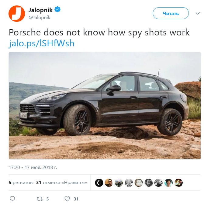 «Твиттер»: «Porsche выпустила официальные „шпионские“ снимки готовящейся к выпуску модели автомобиля Macan». Комментарии: «Шпионские снимки — мой оксюморон недели», "Шпионские снимки так не работают«