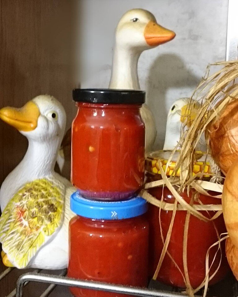 Некоторые любят погорячее. Конфитюр из чили-перца - это вам не сладкое варенье, не клубничный джем! Это для настоящих южных горячих людей, каковых немало в Калабрии на юге Италии, да и на нашем юге наверняка найдутся любители Marmellata di Peperoncino! Южная страсть, сладкая, но острая, варится из: ✔12 острых красных перчин ✔6 мясистых красных болгарских перчин ✔6 крупных яблок ✔100 г сахара ✔4 столовых ложек меда ✔150 мл красного вина ✔4 столовых ложек бальзамического уксуса ✔ Специй: тимьян, розмарин, кориандр, оригано (в итальянском ударение ставится на И!) - Яблоки чистим от кожуры режем произвольно, засыпаем в казан. - Перцы, как острые, так и болгарские, чистим от семян и перепонок, складываем в казан. - Наливаем вино, засыпаем сахар и варим на медленном огне 40-50 минут. - Когда яблоки уже почти растаяли, берем блендер и перебиваем в однородную массу. Варим еще 20 минут. - Добавляем мед, специи и бальзамический уксус и варим еще 20 минут. - Как понять, что конфитюр готов? Надо н