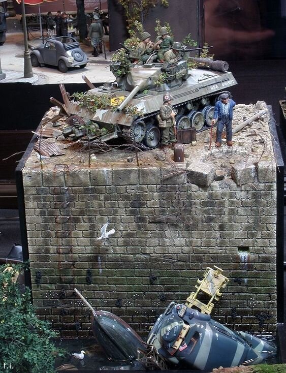 Диорама это кусочек или момент жизни, который реалистично изготовил мастер. Они во основном военной тематики, но так же бывают других направлений. Творческий процесс начинается с наброска итоговой сцены, где необходимо расположить все модели и детали, и соблюсти масштаб. Из-за размера диорамы складывается цена, чем больше, тем дороже. Но качество не теряется в любых размерах, тут самое главное это реалистичность. Любая диорама начинается с подставки, она может участвовать в сюжете или быть просто основой композиции. Часто в сюжетах используют пластиковые модели кораблей, людей, самолетов и танков. Эти модели необходимо довести еще "до ума", раскрасив или нанеся повреждения, чтоб реалистично вписать их в сюжет будущей композиции. Основной материал строительства объектов пенополистирол, он отлично подходит для имитации кирпичной кладки или тротуарного камня, дальше все решает краска и последующая растушёвка. Так же в процессе создания сцены участвуют и другие материалы эпоксидная смола
