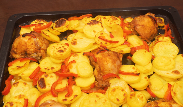 Что может быть вкуснее и проще картошки с курицой, приготовленной в духовке?! Для приготовления нам потребуется: Для начала замаринуем курочку. Добавим одну чайную ложку соли, карри, немного молотой паприки, чеснок и все хорошенько перемешаем. Чтобы специи распределились равномерно, курице необходимо дать постоять минут 10. Пока ждем займемся приготовлением картофеля. Нарежем его, а также нарежем сладкий болгарский перец. Вырезаем картофель кружочками не очень толсто, но и не совсем тоненько. Перец нарежем не очень крупной соломкой. В картошку добавляем соль, измельченный чеснок, смесь перцев, сметану и всё хорошо перемешиваем, чтобы картофель пропитался. Выкладываем и распределяем картофель. Далее выкладываем кусочки курицы и сладкий перец. Этот рецепт меня выручает, когда знаю, что приедут гости. Духовку разогреваем до 220 градусов, ставим запекаться. Общее время приготовления 30 минут. Через 15 минут аккуратно перемешаем. Еще через 15 минут достаем готовое блюдо. Картошка с куриц