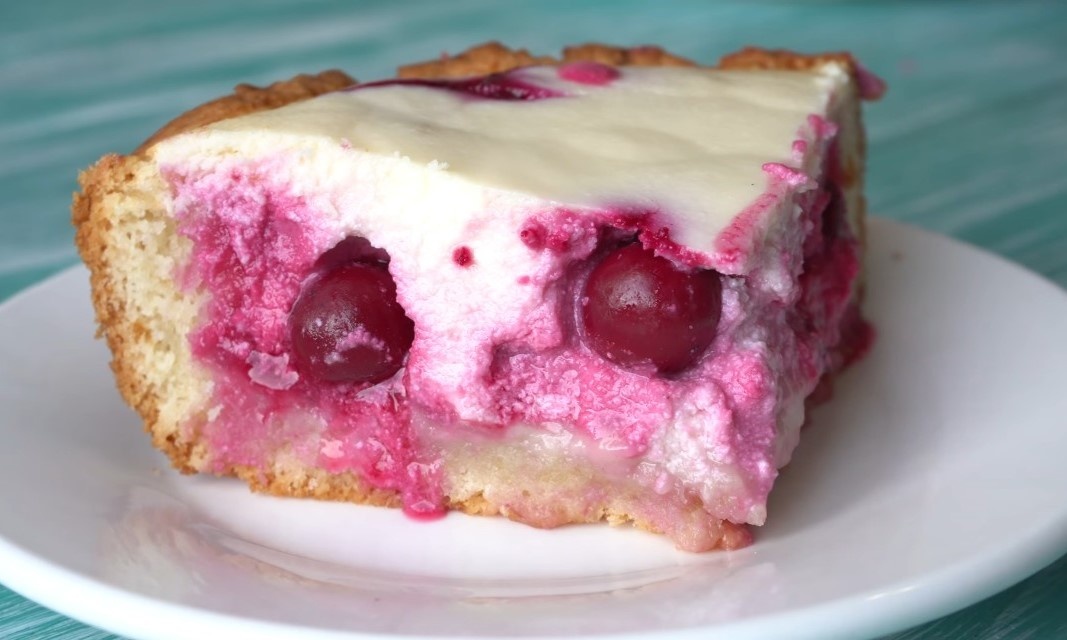 Вишня замороженная – 400 гр. 1)В глубокую миску положите мягкое сливочное масло, добавьте сметану и сахар. Лопаточкой разомните. 2)Добавьте муку, разрыхлитель и хорошо перемешайте. Когда тесто загустеет, начните замешивать руками. Готовое тесто положите в целлофан и уберите в холодильник, на время пока будете готовить начинку. 3)Для этого возьмите чашу измельчителя. Положите туда творог, сахар, крахмал, яйцо. Все перемешайте до однородной массы. Уберите пока в сторону и возьмите форму для выпечки, у меня 24 см. Смажьте ее маслом. 4)Кладите туда охлажденное тесто и руками равномерно распределите. Сформируйте бортики. 5)Высыпьте вишню, у меня замороженная. Далее сверху вылейте творожную заливку. Выпекайте в духовке на 180°C 45-50 минут. После этого полностью остудите пирог. И только потом нарезайте. Приятного чаепития!