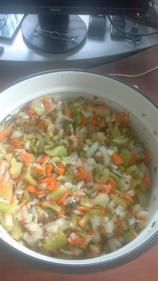 Итак. Основа в пропорциях: 3 кг зеленых или бурых помидор, 2 кг морковки, полтора кг лука, 3 сладких перца, 3 острых перца, 3 головки чеснока и примерно половинка среднего кочана капусты, хороший пук сельдерея и такой же петрушки и соль-сахар!